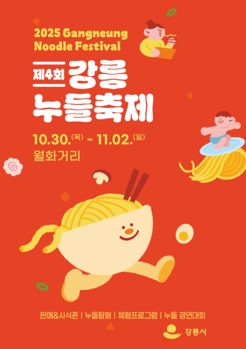 월화거리 일원에서 열리는 누들축제는 낮 12시부터 9시까지(11월 2일은 오후 6시 종료) 운영된다. 강릉의 대표 면 요리와 이색적인 메뉴를 선보이는 누들존, 음료·간식을 곁들일 수 있는 페어링존 등 30여개 부스가 운영된다.