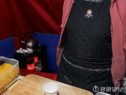김밥장사를 하는 이순덕(64)씨는 최근 기온이 뚝 떨어지자 창고에서 난로를 꺼냈다. 이씨는 “하루 장사를 위해 매일 새벽 3시부터 재료를 손질하다 보면 뼛속까지 시리다. 오늘은 앞치마도 두꺼운 안감이 덧대진 겨울용으로 입고 왔다”며 불앞에 손을 쬐었다.