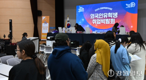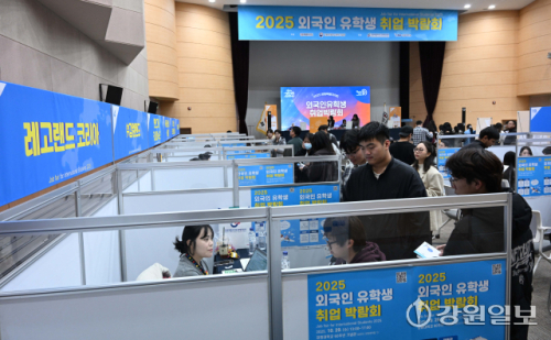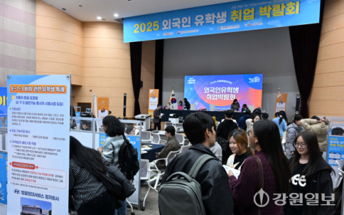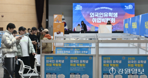 29일 강원대 춘천캠퍼스에서 열린 외국인 유학생 취업박람회를 찾은 유학생들이 각 기업 부스를 찾아다니며 구직활동하고 있다.