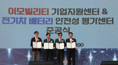 이모빌리티 기업지원센터는 국비 240억원, 도비 240억원 등 총 사업비 480억원이 투입돼 연면적 3,835㎡ 규모의 전자파 적합성 시험동(EMC)과 배터리 안전성 시험동으로 조성됐다. 또 실차 주행이 가능한 시험주행로를 함께 조성해 배터리팩의 성능 및 안전성은 물론 차량의 주행 테스트까지 수행할 수 있는 통합성능평가체계를 갖췄다.