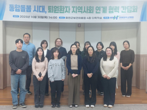 이날 간담회는 화천군보건의료원 4층 다목적실에서 열려 내년 3월 시행 예정인 ‘통합돌봄법’에 대응하고 화천 거주 지역 퇴원환자가 병원 퇴원 후에도 지역사회 내에서 지속적으로 관리·돌봄을 받을 수 있는 체계적 연계 시스템을 구축하기 위해 마련됐다.