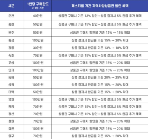 1인당 구매 한도는 횡성·고성·인제·삼척·영월·화천 등이 100만원으로 가장 높다.