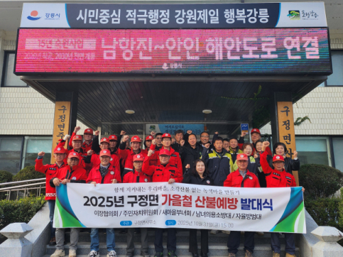 구정면(면장:박인순)은 31일 구정면사무소에서 구정면 이장협의회를 비롯한 5개 지역 산불 수호단체장 및 산불전문예방진화대, 산불감시원, 관계공무원 등 지역 산불 대응의 핵심 인력이 참석한 가운데 가을철 산불 예방 활동의 본격적인 시작을 알리는 ‘2025년 가을철 산불예방 발대식’을 개최했다.