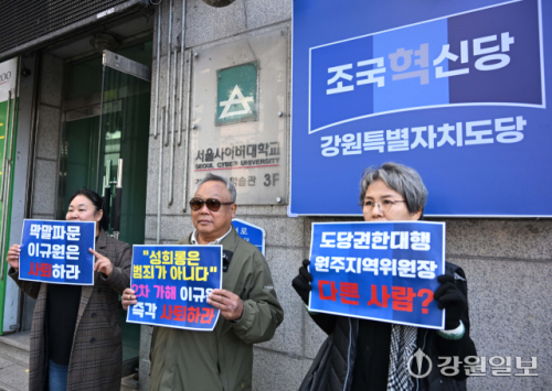 한편, 이날 개소식에 앞서 일부 당원들은 당내 성 비위 사건에 대해 "성희롱은 범죄가 아니라"라는 발언으로 논란을 빚은 이규원 전 도당위원장 권한대행의 원주시지역위원장 사퇴를 촉구하는 피켓시위를 진행했다.