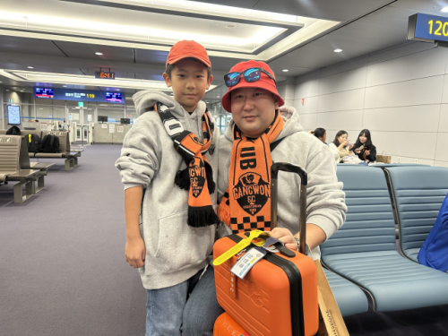 이날 오전 5시 인천국제공항 제1터미널은 새벽부터 활기로 가득했다. 강원FC 유니폼을 맞춰 입은 팬들은 커피를 들고 “히로시마에서 만나요!”라며 인사를 건넸다. 팬들은 오전·오후 두 조로 나뉘어 일본으로 향했다.