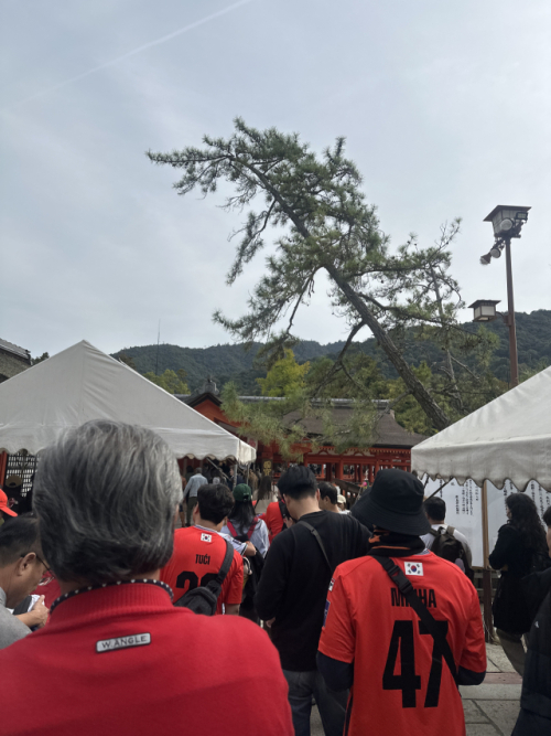 오전조는 비행기로 도착한 직후 미야지마 일대를 둘러보며 현지 문화를 체험했다. 유네스코 세계유산 이쓰쿠시마 신사 앞에서 팬들은 ‘강원 나르샤’ 머플러를 펼쳐 들고 단체사진을 찍으며 “오늘은 우리가 주인공”이라고 웃었다. 오후조는 도착한 직후 곧장 경기장으로 이동해 응원 준비에 들어갔다.