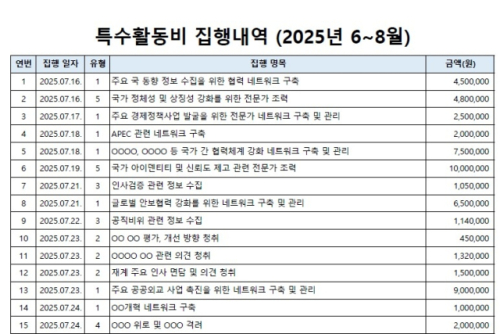 예컨대 대통령실은 '주요국 동향 정보 수집을 위한 협력 네트워크 구축'(7월 16일)에 450만원, '대북 정책 현안 정보 수집'(8월 6일)에 58만원, '한미동맹 현안 정보 수집'(8월 7일)에 64만원을 썼다.