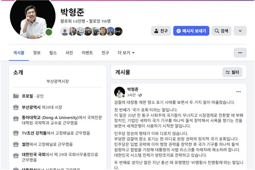 속보= 대장동 민간업자 사건 항소 포기 결정과 관련해 검찰 내부 반발이 확산하고 있는 가운데 박형준 부산시장은 11일 "최근 검찰의 대장동 재판 항소 포기는 한 마디로 완장 권력의 정치적 국가 포획"이라고 비판했다.
