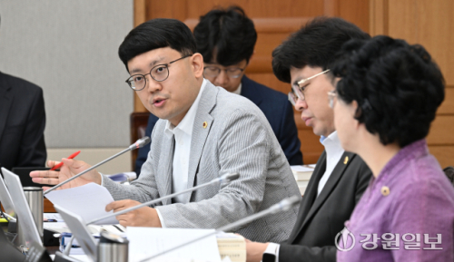 강원특별자치도의회 교육위원회(위원장:이영욱)는 11일 위원회 회의실에서 도교육청 정책국에 대한 행정사무감사를 실시했다. 최재민(국민의힘·원주) 의원이 도내 학교 현장 태블릿PC 추가 구매·배포 계획과 관련해 질의하고 있다. 박승선기자