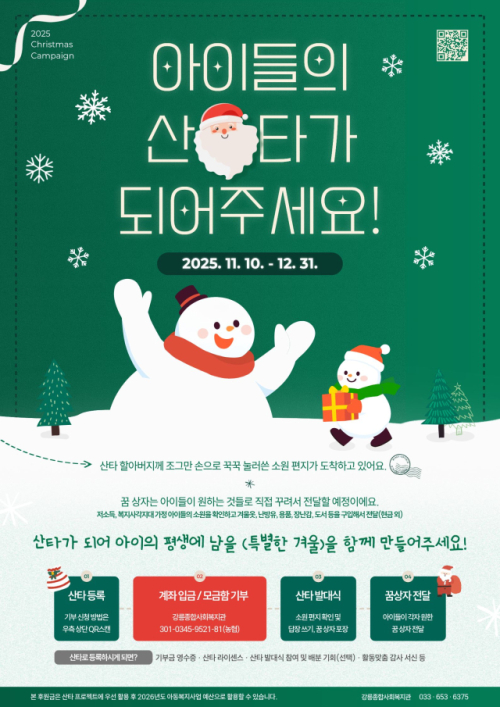 【강릉】강릉종합사회복지관은 연말을 맞아 ‘산타 프로젝트’ 집중 모금을 오는 12월 말까지 추진한다.