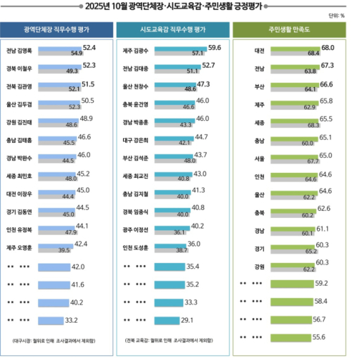 이번 조사는 리얼미터가 2025년 9월28일~9월30일, 10월30일~11월1일 전국의 18세 이상 유권자 1만3,600명(광역단체별 9~10월 각 800명)을 대상으로 유·무선 임의전화걸기(RDD) 자동응답 방식을 통해 진행했다. 통계분석은 2개월 이동(rolling) 시계열 자료분석 기법을 적용했으며, 통계보정은 올 6월 말 행정안전부 주민등록 인구통계 기준 성별·연령대별·권역별 가중치를 부여했다. 광역단체별 표본오차는 95% 신뢰수준에서 ±3.5%포인트이며, 응답률은 3.6%다.