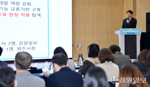 2025강원교육정책 발굴을 위한 국제심포지엄 18일 춘천ICT벤처센터에서 열려 최승국 도계고교장이 '대만 교육정책을 통해 바라본 강원 학력 정책비전'을 주제로 발표하고 있다. 박승선기자