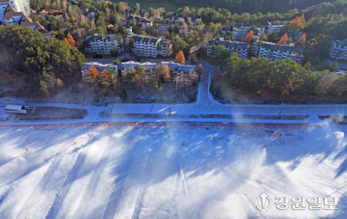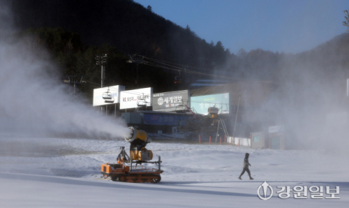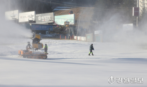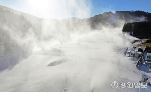 도내 산지의 아침 최저 기온이 영하 10도까지 떨어진 18일 평창군 대관령면 모나 용평 스키장이 겨울철 개장을 앞두고 제설 작업이 한창이다. 평창=권태명기자