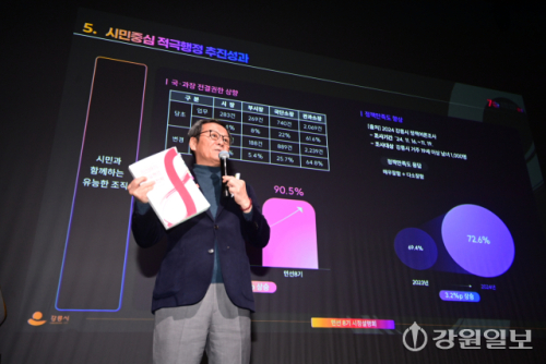김 시장은 강릉시 공무원 친절도 향상, 공공기관 청렴도 평가 강릉시 최초 2등급 달성 등 시민중심 적극행정 추진성과를 설명했다. 이어 도 제2청사 유치 추진, 국립국악원 분원 유치, 해조류 생산 및 양식업 특화 지원, 과학산업단지 확장 등 24개의 공약을 이행해 이행률 80%를 기록 중이라고 덧붙였다. 시는 올 연말까지 이행률 90% 달성을 목표로 하고 있다.