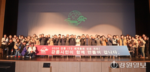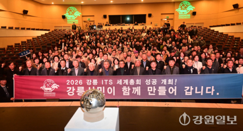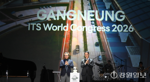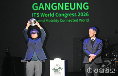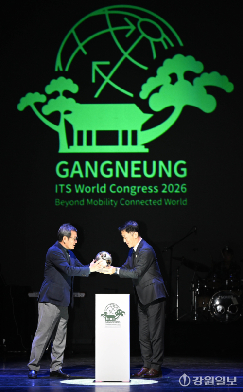 2026 ITS 세계총회 개최 붐업을 위한 글로브 세리머니가 19일 강릉아트센터 사임당홀에서 열려 김홍규 강릉시장이 김남구 ITS 세계총회 조직위원회 사무국장으로부터 총회의 상징물인 ‘ITS글로브’를 전달받고 있다. 국제 교통올림픽으로 불리는 2026 강릉 ITS 세계총회는 내년 10월 19일부터 5일간 강릉올림픽파크 일대에서 열린다. 강릉=권태명기자