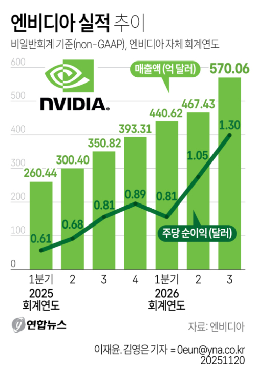 엔비디아는 자체 회계연도 3분기(8∼10월) 매출액이 지난해 같은 기간 대비 62% 증가해 사상 최대인 570억1천만 달러(약 83조4천억원)를 기록했다고 19일(현지시간) 밝혔다.