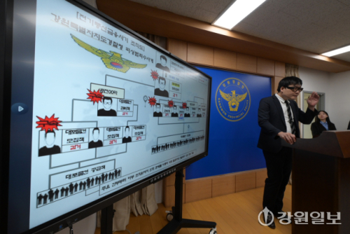 ◇강원경찰청이 20일 기자실에서 ‘캄보디아 피싱 범죄조직에 대포통장 공급 유통한 일당 59명 검거’ 관련 브리핑하고 있다. 박승선기자