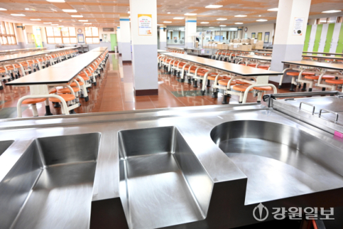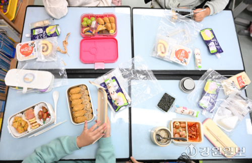 학교 현장에서 급식과 돌봄 업무를 맡고 있는 전국학교비정규직노조가 총파업하며 급식이 중단된 20일 춘천시내 한 초교에서 학생들이 간편식과 집에서 싸온 도시락으로 점심을 해결하고 있다.
