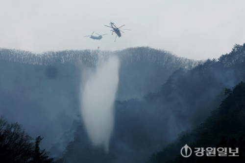 양양에서 발생한 산불 진화율이 70%를 보이는 가운데, 출동한 소방헬기들이 진화에 총력을 다하고 있다. 양양=권태명기자