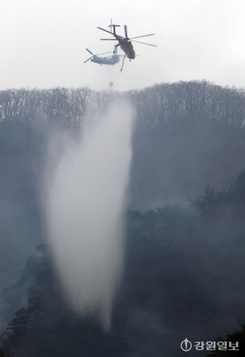 23일 양양군 서면 서림리 방태산 인근에서 발생한 산불을 끄기위해 산림청 산불 진화 헬기, 군헬기 등이 진화작업을 하고 있다. 지난 22일 발생한 산불에 산림과 소방 당국은 산불 진화 헬기 26대를 차례대로 투입해 16시간여만인 23일 오전 10시 20분께 산림 약 22.5㏊(22만5천㎡)를 태우고 꺼졌다. 양양=권태명기자