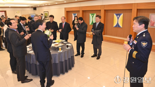 제20회 동곡상(東谷賞) 수상자 축하 리셉션이 25일 춘천 세종호텔에서 열려 최현석 강원경찰청장이 건배제의를 하고 있다. 박승선기자