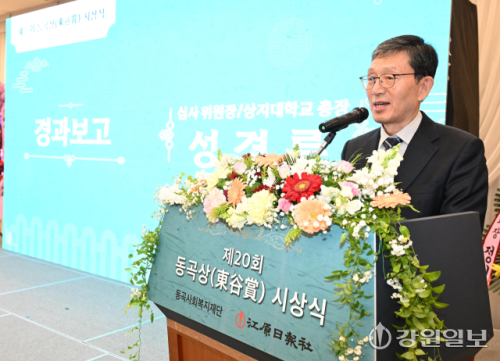 성경륭 상지대 총장(심사위원장)이 25일 춘천 세종호텔에서 열린 제20회 동곡상(東谷賞) 시상식에서 경과보고하고 있다. 신세희기자25일 춘천 세종호텔에서 열린 제20회 동곡상(東谷賞) 시상식에서 참석 내빈들이 국민의례를 하고 있다. 신세희기자25일 춘천 세종호텔에서 열린 제20회 동곡상(東谷賞) 시상식에서 소프라노 윤현정이 축하공연을 선보이고 있다. 박승선기자25일 춘천 세종호텔에서 열린 제20회 동곡상(東谷賞) 시상식에서 소프라노 윤현정이 축하공연을 선보이고 있다. 박승선기자