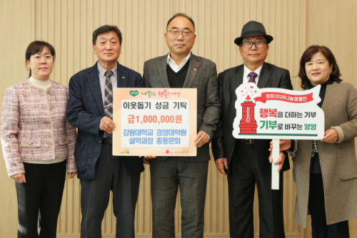 강원대 경영대학원 설악과정총동문회(회장:김창천)는 26일 양양군청을 찾아 탁동수 양양군수권한대행에게 이웃돕기성금 100만원을 기탁했다.