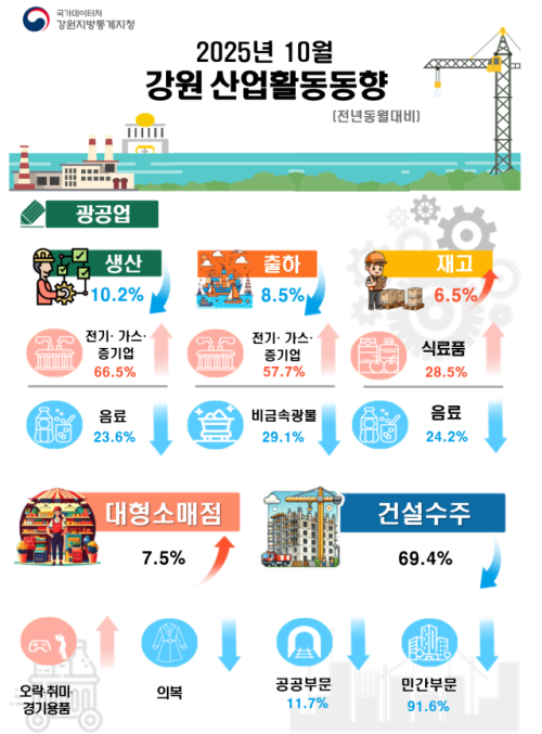 한편 상승세로 전환됐던 도내 광공업 생산은 지난해보다 10.2% 감소하며 한달 만에 마이너스를 나타냈다. 건설수주액은 전년동월대비 69.4% 감소하는 등 위축 기조를 이어갔다.