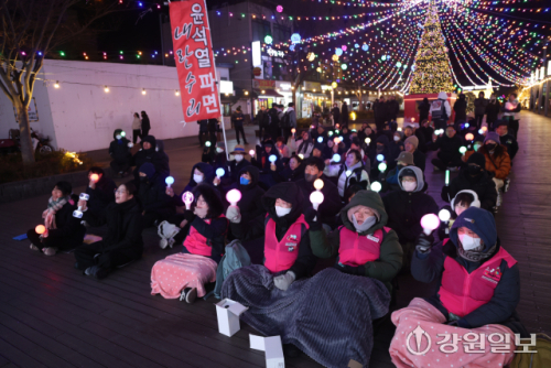 12·3 비상계엄 1년을 맞은 3일 강릉시 임당동 월화거리에서 응원봉을 들고 집회에 참여한 시민들이 내란 종식을 촉구하며 구호를 외치고 있다.