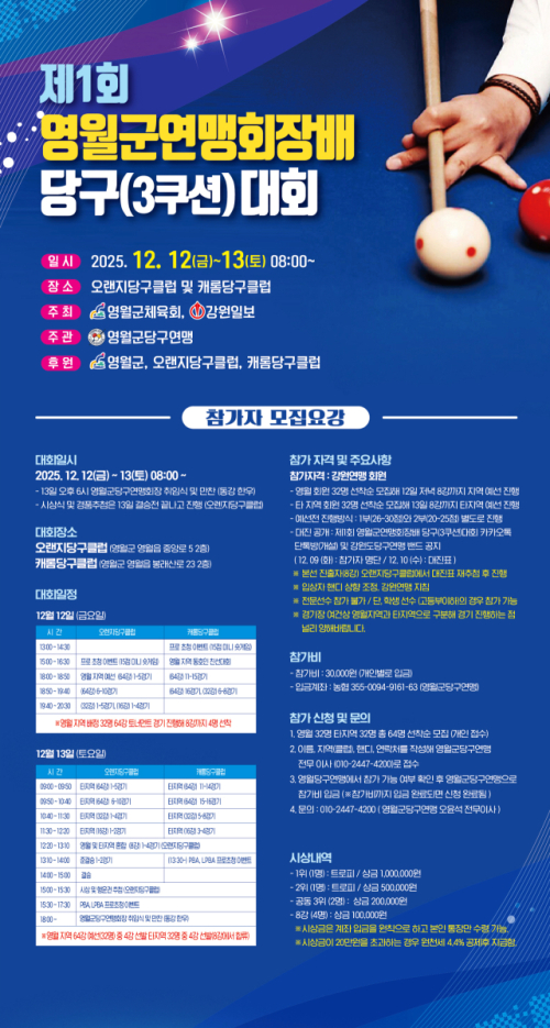 신동주 군당구연맹회장은 “대회 참가자와 관중들이 영월에서 좋은 경험을 하고, 그 발걸음이 지역 상권과 동호인 문화의 활력으로 이어지도록 최선을 다하겠다”며 “당구를 매개로 더 많은 동호인들이 연결되고, 영월의 생활체육 기반이 한 단계 더 단단해지는 계기가 될 수 있도록 노력하겠다”고 말했다.