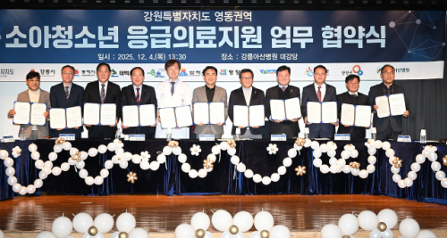 강원특별자치도와 강릉아산병원, 평창군을 포함한 9개 시·군이 함께하는 '영동권역 소아청소년 응급의료 지원' 업무협약식이 4일 강릉아산병원 강당에서 김진태 강원특별자치도지사, 심재국 평창군수, 유창식 강릉아산병원장을 비롯한 시·군 지자체장 및 관계자들이 참석한 가운데 열렸다.