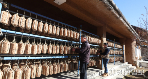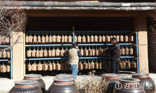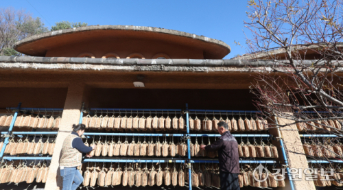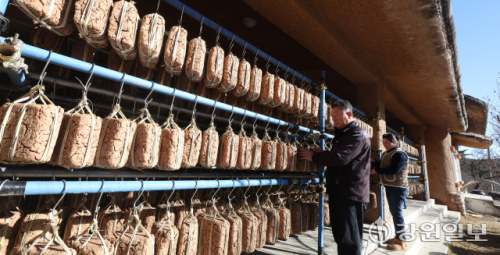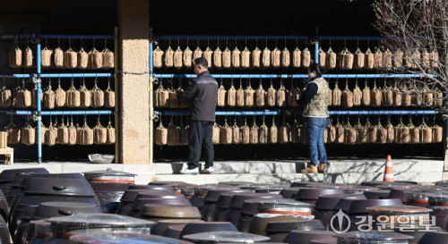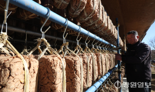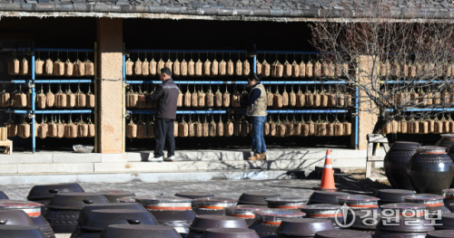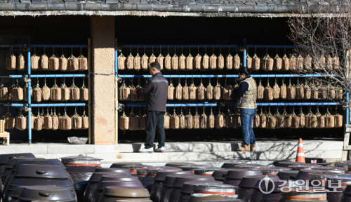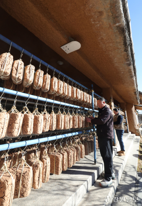 연일 추위가 이어진 4일 강릉시 성산면 보광리 전통 장공장에서 메주가 대관령 바람과 햇볕을 맞으며 익어가고 있다. 이 메주는 40여일간 햇볕에 말려 실내로 옮겨진 뒤 건조와 발효기간을 거쳐 내년 2~3월쯤 된장과 간장 재료로 쓰인다. 강릉=권태명기자