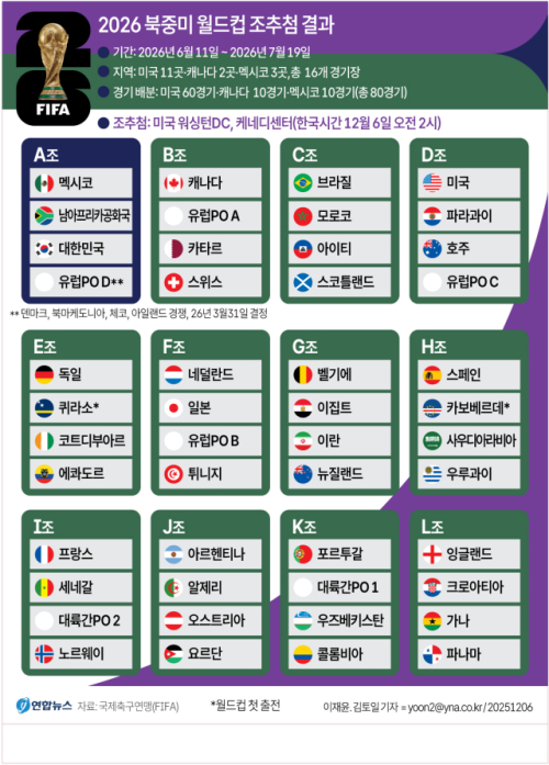 한국은 내년 6월12일 오전 11시(한국시간) 멕시코 과달라하라 아크론 스타디움에서 유럽 PO 패스D 승자와 1차전을 치른다. 이어 19일 오전 10시에는 같은 장소에서 멕시코와 맞붙는다. 조별리그 최종전은 25일 오전 10시 몬테레이 BBVA 스타디움에서 남아공과 치른다.