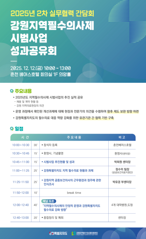 2025년 2차 실무협력 간담회·강원지역필수의사제 시범사업 성과공유회는 △시범사업 추진현황 및 성과 보고 △강원특별자치도 지역 필수의료 현황과 과제 △강원지역 공중보건의사의 근무환경과 정주에 관한 인식조사 △지역필수의사제의 안정적 운영과 강원특별자치도 필수의료 강화 방향인 패널 토론 순으로 열린다.