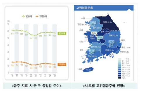 도내 고위험 음주율과 월간음주율은 코로나19 유행 시기에 일시적으로 줄었지만 이후 다시 증가 추세다.