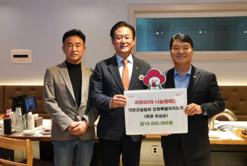 대한건설협회 강원특별자치도회(회장:최상순)는 12일 홍천읍내 모처에서 신영재 홍천군수가 참석한 가운데 지역 취약계층을 위해 성금 1,000만원을 기탁했다.