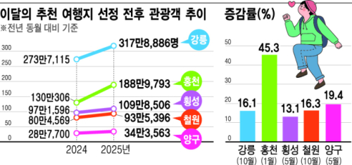 특히 ‘2025~2026 강원 방문의 해’를 맞아 이달의 추천 여행지로 선정된 시·군의 관광객 수가 크게 증가했다.