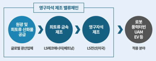 이에 따라 원광 및 희토류 산화물(글로벌 광산업체)–희토류 금속(베트남, LS에코에너지)–영구자석(미국, LS전선)으로 이어지는 희토류 영구자석 밸류체인 구축이 본격화된다.
