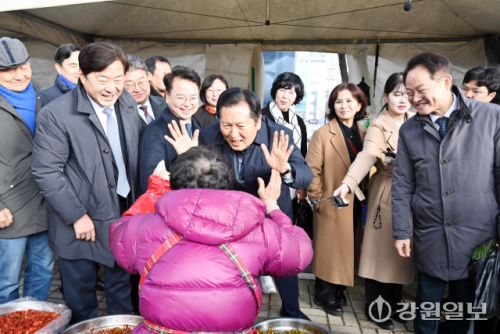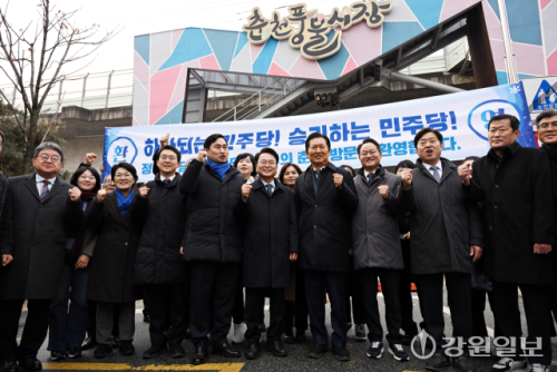 민주 지도부 춘천 시장 방문, 강릉 물부족 예산 확보 보고로 민심 공략