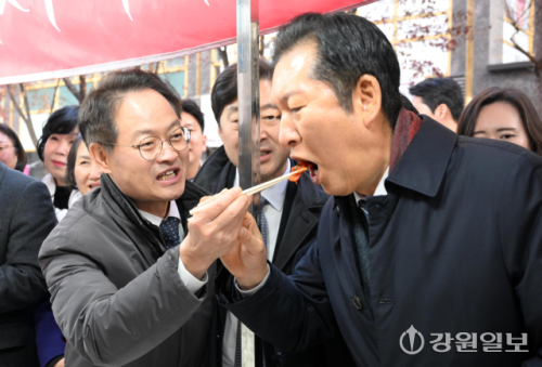 ◇17일 춘천 풍물시장을 찾은 허영 국회의원이 정청래 더불어민주당 대표에게 홍어무침을 권하고 있다. 신세희기자