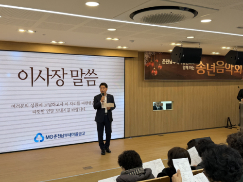 춘천남부새마을금고(이사장:정용현)는 18일 대회의실에서 ‘제2회 춘천남부새마을금고 송년음악회’를 진행했다. 이날 소프라노 장희수, 테너 함민규, 가수 강설민, 어쿠스틱 밴드 바람소리 등이 공연을 펼쳤으며, 행운권 추첨 등 이벤트도 이어졌다.