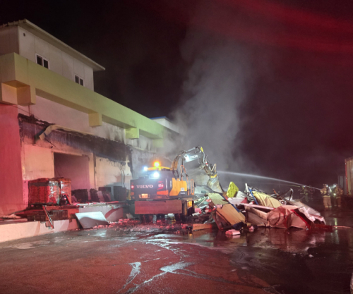 ◇횡성군 횡성읍 한 축산 가공 공장에서 지난 19일 오후 7시58분께 불이 나 소방대원들이 진화하고 있다. 사진=독자 제공