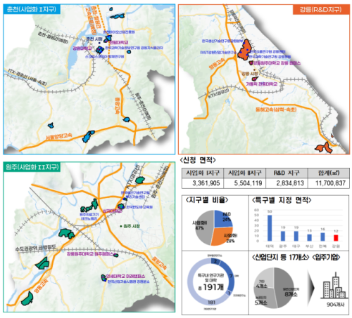 2005년 대덕, 2011년 광주, 대구, 2012년 부산, 2015년 전북에 10년 만의 신규 지정으로 바이오 신소재(춘천), 디지털 헬스케어(원주), 반도체(센서) 소재·부품(강릉) 등 3대 특화산업을 중심으로 집중 육성할 예정이다. 강원도는 그동안 연구개발특구 지정 요건을 충족하지 못해 도전조차 할 수 없었으나 강원특별법 특례를 통해 지정 요건이 완화되면서 신청이 가능해졌다. 다만 춘천·원주·강릉 개별 도시 단위로는 여전히 지정 요건 충족에 한계가 있어 정부와의 협의를 통해 3대 도시의 연구·산업 역량을 하나로 결집하는 연합형 연구개발특구 모델을 제안, 신규 지정을 받는데 성공했다.