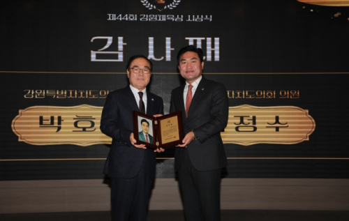 김정수(국민의힘·철원)·박호균(국민의힘·강릉) 강원특별자치도의원은 지난 18일 강원도 체육계 발전에 기여한 공로로 감사패를 수여받았다. 이날 열린 제44회 강원 체육상 시상식에서 김정수 의원은 시·군별 체육회 예산 지원, 박호균 의원은 체육 인프라 개선 등에 힘써온 점을 인정받아 각각 감사패를 받았다.