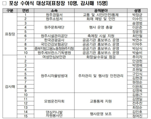 이날 자리에서는 교통 및 안전 통제, 공공기관 홍보부스 운영 등 성공적인 축제에 노력한 공로로 10명이 표창장을, 15명이 감사패를 받았다.