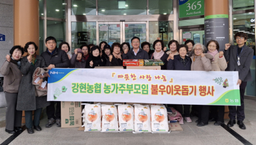강현농협(조합장:김영지)과 강현농협농가주부모임(회장:김영이)은 23일 강현농협 앞에서 지난 7~8월 실시한 불우이웃돕기 지역농산물 판매 수익금으로 구입한 쌀과 김 등 사랑의 물품을 지역의 어려운 이웃에게 전달했다.