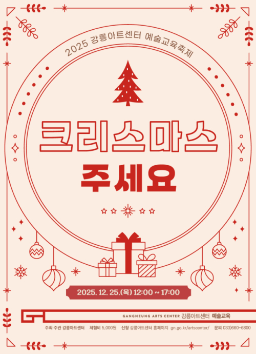 25일 낮 12시에는 시민 모두가 참여할 수 있는 예술교육축제 ‘크리스마스주세요’가 열린다. 크리스마스를 주제로 한 다양한 체험 프로그램과 음악회, 공연 상영관 등 공연장 전 공간을 활용한 예술교육 프로그램으로 운영된다. 두 행사의 자세한 일정과 참여 방법은 강릉아트센터 누리집에서 확인할 수 있다.