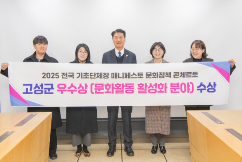 고성군과 고성군문화재단은 한국매니페스토실천본부가 주최한 ‘제1회 2025 전국 기초단체장 매니페스토 문화정책 콘체르토’에서 문화활동 활성화 분야 ‘우수상’을 수상하며 전국적인 문화자치 선도모델로 인정받았다.
