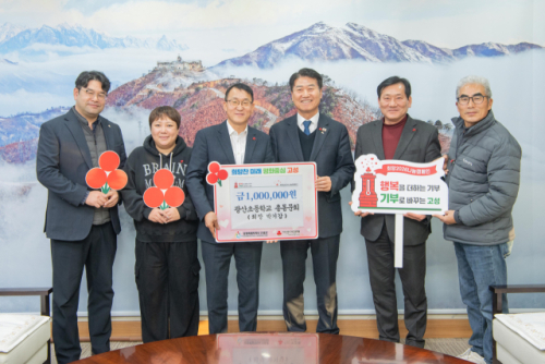 고성군 광산초등학교 총동문회(회장:박기갑)는 29일 고성군청을 방문, 사랑의 성금 100만원을 함명준 군수에게 기탁했다.