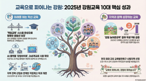◇강원교육 브랜드화 성공=도교육청은 이러한 성과들을 아우르는 브랜드 슬로건 교육이 피어나야, 강원이 피어납니다’가 교육부 홍보 우수사례로 선정되는 등 대내외적인 공감과 신뢰를 얻는 데 성공했다고 밝혔다. 이번 성과 발표는 교육이 단순히 학교라는 공간을 넘어 지역의 생존과 번영을 위한 핵심 동력임을 입증했다는 점에서 큰 의미를 갖는다고 할 수 있다.